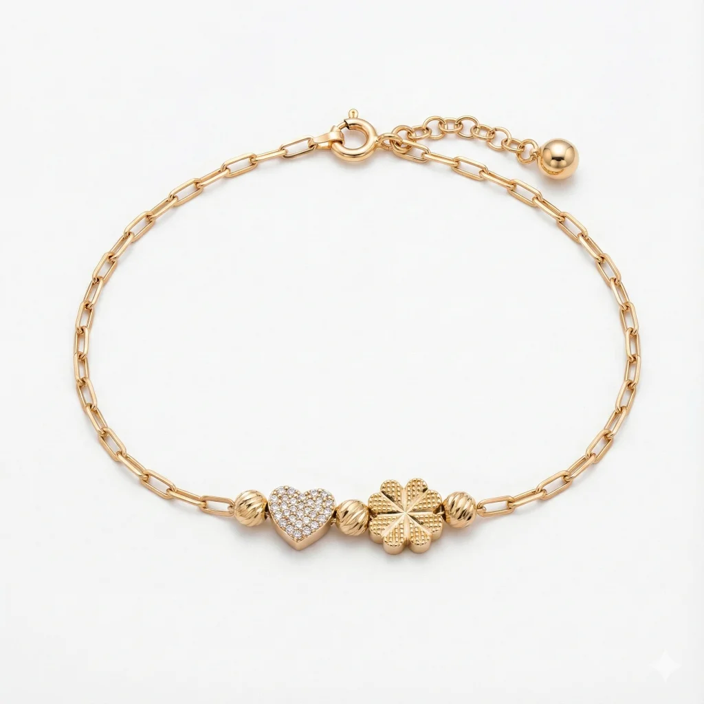 Bileğinizdeki zarafeti, anlamlı sembollerle taçlandırın. Modern takı modasının vazgeçilmezi olan ataç (paperclip) zincir tasarımı, şansı simgeleyen dört yapraklı yonca ve sonsuz sevgiyi ifade eden kalp figürü ile bu özel tasarımda buluştu.