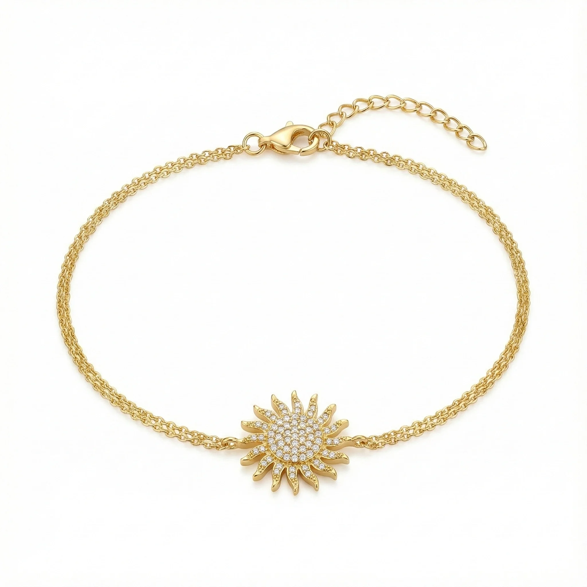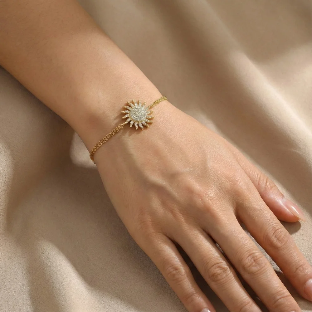 Bileklik, güneş desenli tasarımı ve taş detayları ile oldukça şık bir görünüme sahiptir. 14 ayar altından üretilmiş olan bu bileklik, kaliteli malzemesi ile uzun ömürlü bir kullanım sunar.