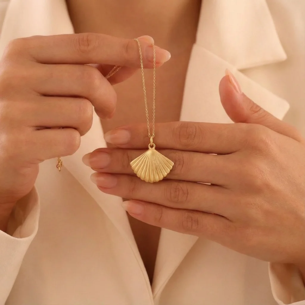 İstiridye Tasarım 14 Ayar Kolye, zarif ve şık tasarımıyla göz kamaştırıyor. %100 orijinal 14 ayar altından üretilmiştir.